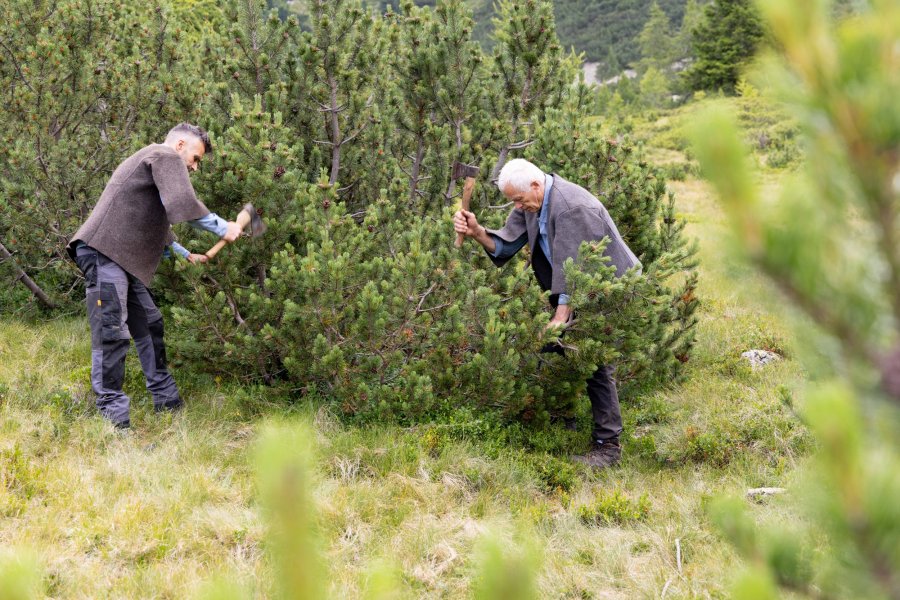 I mughi vengono tagliati, cioè i rami con gli aghi vengono abilmente staccati con l’accetta: un lavoro non privo di insidie.